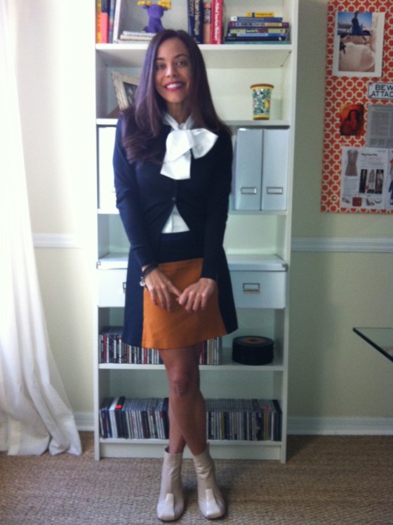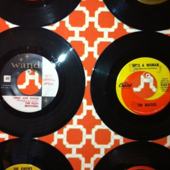 ;  Eu trouxe de NY uns disquinhos 45 rotações que foram do meu sogro com a intenção de usá-los na decoração do meu home office (na foto dá pra vê-los no lado direito da estante). Ainda não sei como vou usá-los mas me inspiraram a fazer um look meio anos 60hoje.