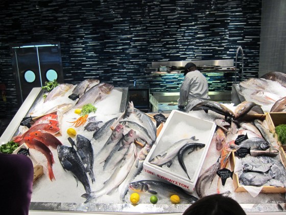 O cardápio traz pratos da cozinha internacional, tais como o sashimi de atum, tartar de salmon e lagosta, mas o foco são as opções da cozinha grega tradicional, e os peixes, que você pode escolher inteiro e determinar a forma de preparo. Vale notar que os peixes e frutos do mar são vendidos por quilo e que os preços são bem salgadinhos. Afinal, não deve ser barato trazer peixe diariamente de avião. O meu conselho? Pergunte o preço antes de escolher.